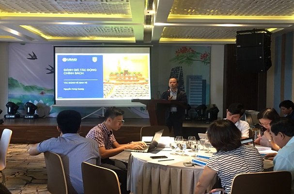 Mở đầu Hội nghị tập huấn, ông Nguyễn Hưng Quang, Giám đốc Văn phòng NH Quang & Cộng sự giới thiệu nội dung liên quan đến đánh giá tác động về kinh tế, ông trình bày những nội dung cơ bản về đánh giá tác động kinh tế, các công cụ và kỹ thuật để đánh giá cũng như quy trình, các bước thực hiện đánh giá tác động kinh tế trong quy tình tổng thể về đánh giá tác động chính sách. Với ví dụ là chính sách “tăng tuổi hưu” theo một trong ba phương án: (i) tăng tuổi nghỉ hưu của nam và nữ (ii) nam nữ cùng mức tuổi nghỉ hưu là 60 tuổi và (iii) năm 60 tuổi, nữ 58 tuổi. ông đưa ra để các nhóm học viên trình bày và tiến hành đánh giá tác động về kinh tế.