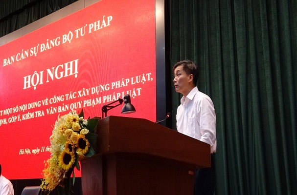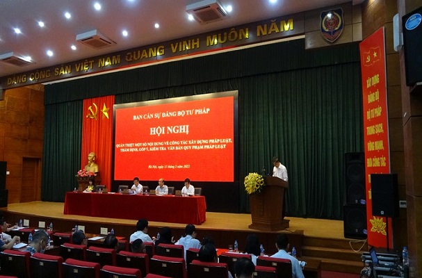 (PLVN) - Ban cán sự đảng Bộ Tư pháp vừa tổ chức Hội nghị quán triệt một số nội dung về công tác xây dựng pháp luật, góp ý, thẩm định, kiểm tra văn bản quy phạm pháp luật. Dự Hội nghị có Phó Chủ nhiệm Ủy ban Pháp luật của Quốc hội Nguyễn Thị Mai Phương, đại diện lãnh đạo một số ban của Đảng, Quốc hội, bộ, ngành Trung ương, Ủy ban Trung ương Mặt trận Tổ quốc Việt Nam. Về phía Bộ Tư pháp có Ủy viên Ban Chấp hành Trung ương Đảng, Bí thư Ban cán sự đảng, Bộ trưởng Bộ Tư pháp Lê Thành Long; các đồng chí Ủy viên Ban cán sự đảng; toàn thể lãnh đạo, công chức các đơn vị: Vụ Các vấn đề chung về XDPL, Vụ Pháp luật dân sự - kinh tế, Vụ Pháp luật hình sự - hành chính, Vụ Pháp luật quốc tế, Cục Kiểm tra văn bản quy phạm pháp luật (VBQPPL), Cục Quản lý xử lý vi phạm hành chính và theo dõi thi hành pháp luật; lãnh đạo các đơn vị liên quan thuộc Bộ; lãnh đạo Văn phòng đảng, đoàn thể và Bộ phận giúp việc Ban cán sự đảng Bộ Tư pháp.