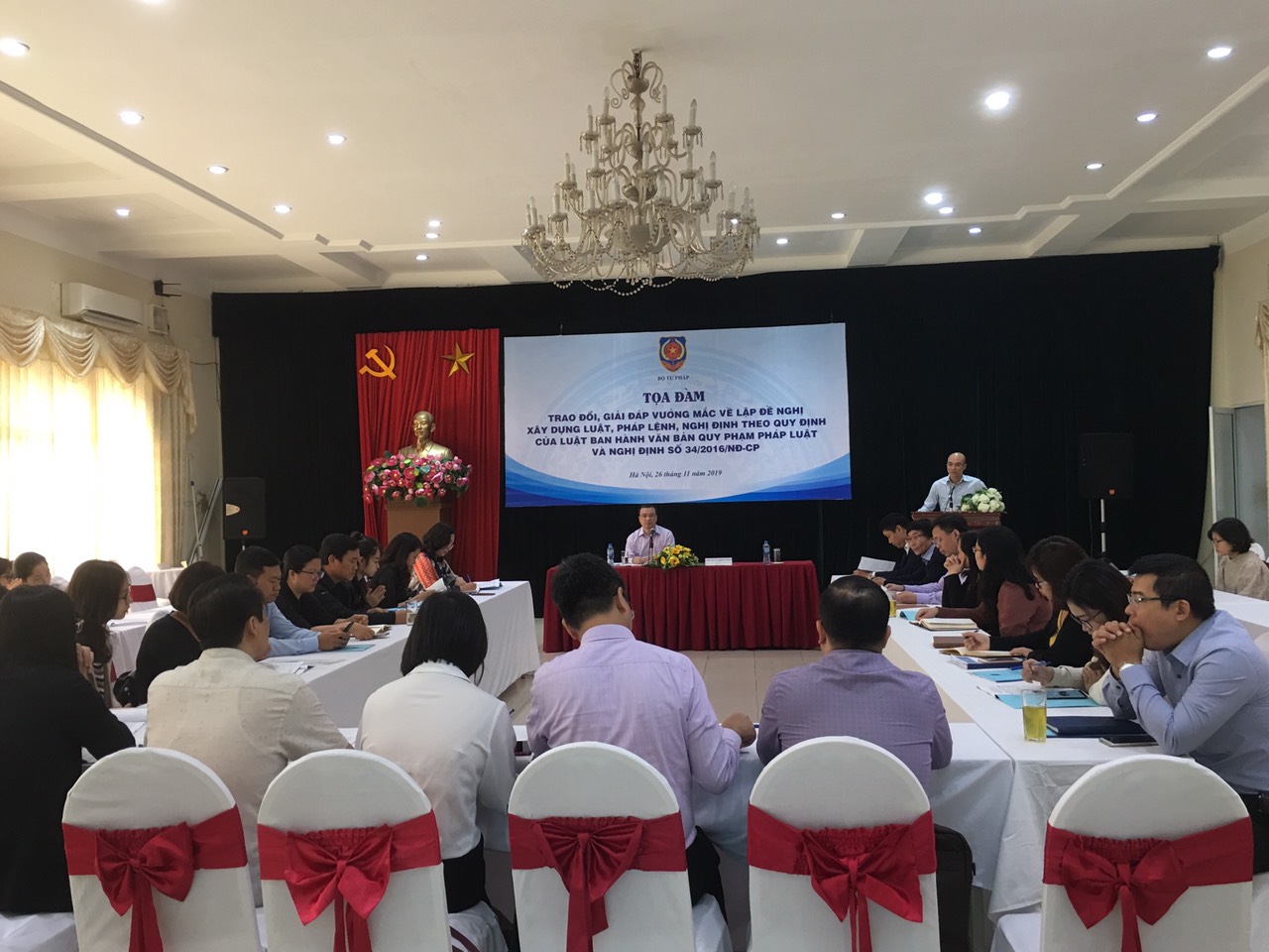 Ngày ngày 26 tháng 11 năm 2019, Bộ Tư pháp đã tổ chức Tọa đàm trao đổi, giải đáp vướng mắc về lập đề nghị xây dựng luật, pháp lệnh và nghị định của Chính phủ với sự tham gia của đại diện pháp chế các bộ, cơ quan ngang bộ, đại diện Vụ Pháp luật, Văn phòng Quốc hội, đại diện Viện Kiểm sát nhân dân tối cao, Tòa án nhân dân tối cao,…